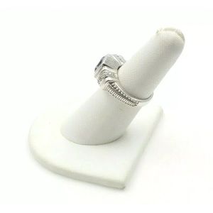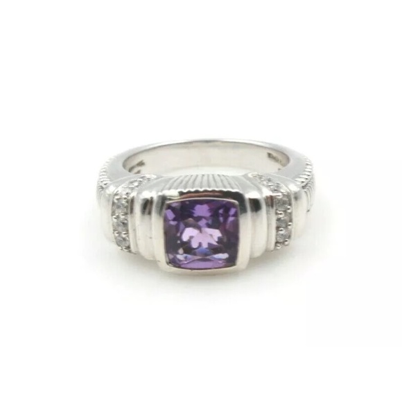 This gorgeous hallmarked Judith Ripka collectible HTF ring features a beautiful cushion cut amethyst stone, surrounded by channel set sparkling CZ stones and a very unusual setting! It’s bold and sexy.