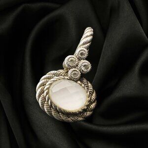 Elegant, dangling designer earrings that showcase a central oval-shaped cubic zirconia stone with a milky white appearance, set in an intricately rope-like sterling silver frame.