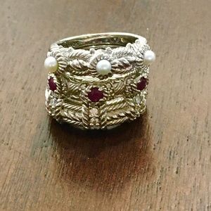 3 Rings can be worn Separately OR Stackable! One ring has Rubies. One ring has Pearls. One ring has Diamonds. It is Sterling Silver Costume Jewelry. Size 8. Bought from QVC. Worn 2-3x.