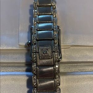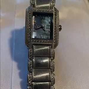 Beautiful, sterling silver, diamonique around bezel, and down sides of each link. Mother of pearl face. I purchased and never worn. Excellent condition. Does need battery. Is sizeable .
