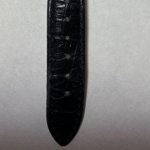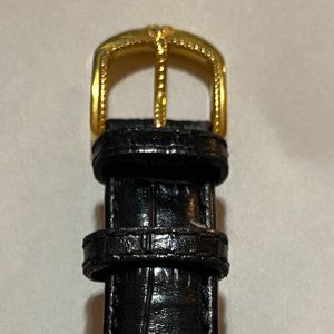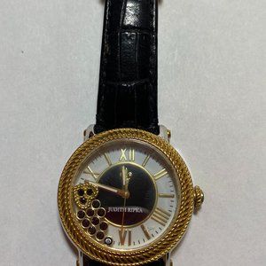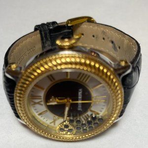 Judith Ripka Women's Watch. Gold-tone bezel. Floating Heart. Genuine black leather band with buckle closure. Fits up to 7 1/4" wrist. Battery installed. Water resistant