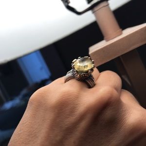 Sterling silver, size 6. Citrine or lemon quartz (I can’t remember) stone is nice and tight. Some scratches. Price reflects GUC