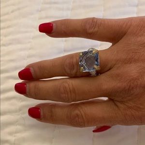 Judith Ripka silver ring with light blue topaz stone, 14 k gold and diamond accent