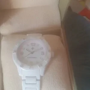 water resistant, beautiful watch, attention to detail. Pink stones on 6 numbers on front of watch. unique band, a must see!! NEVER BEEN USED!
