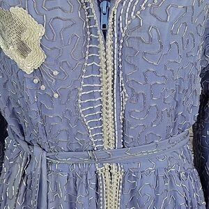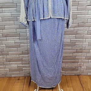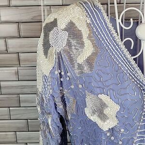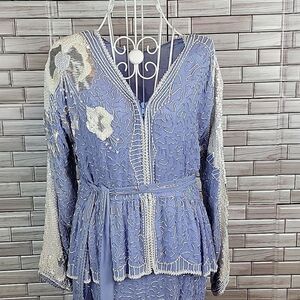 Wear a piece of art by Judith Ann. 100% silk two piece formal wear fully beaded in a one of a kind creation. An asymmetrical floral leaf design including all the way down the sleeves with a large gathered ruffle hemline. A flattering look for any figure. Elastic waistline pull on design skirt with a slit on one side. Beautiful vintage condition. No known flaws.