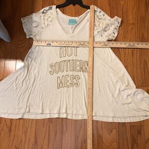 Judith March Sz Medium Hot Southern Mess bling tee/tunic w/crochet/lace sleeves. Like new condition & smoke free/pet free home.