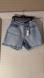 High waisted lite wash denim jean shorts with raw hem and no distressing (except for hem being raw).