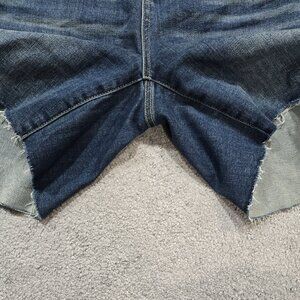 Good used condition, with no stains or tears. Dark wash, high waist jean shorts, with light distressing and raw hems. Stretchy. Has whiskering and intentional fading. Has the classic 5 pocket design, and a zip fly/button closure.