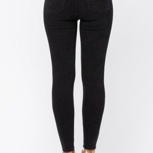 Black high waist, skinny jeans with great stretch like every pair of Judy Blues. Raw bottom cuff.