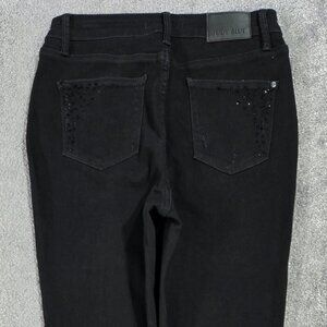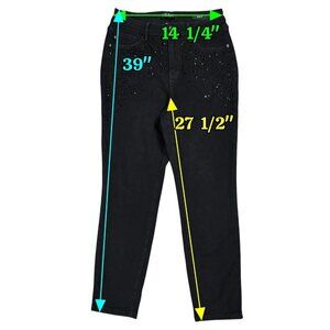 Good used condition, with no stains or tears. Black high rise jeans, with a slim leg. Has beaded accents in the upper areas, front and back. The black color is more of a faded black, not a jet black. Has the classic 5 pocket jean design, and a zip fly/button closure.