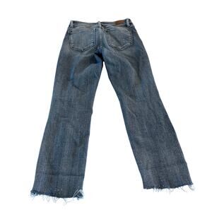 In good used condition. No stains. Distressed. Zipper fly with a button. 27" inseam. Raw hem. Boyfriend fit. Mid rise. Women's size 3 /26.