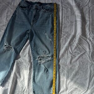 These Judy Blue boyfriend jeans feature a relaxed fit with a high waist, perfect for a laid-back style. The distressed design includes ripped knees and a frayed hem, adding a touch of edgy flair. The blue color and subtle fading enhance their casual appeal.