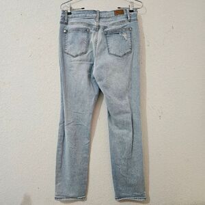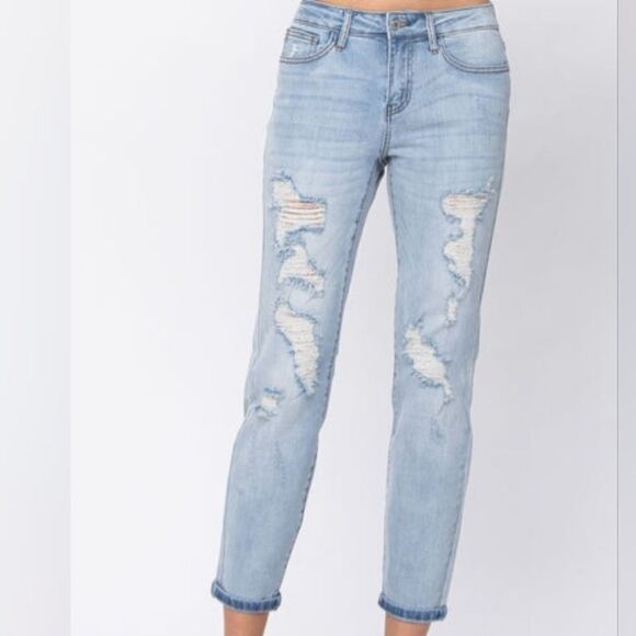 Judy Blue Brittany Mid-Rise Destroyed Boyfriend Jeans, style #8878. light-wash denim with significant distressing, featuring rips and tears on the front of both legs, have a classic five-pocket design, zip fly, and button closure. size 5/27