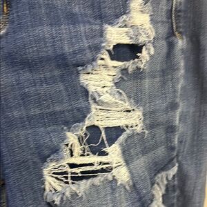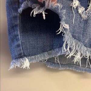 Stylish distressed denim shorts perfect for casual outings. Features a classic blue color with a trendy ripped distressed design. Ideal for a chic, laid-back look. Has a criss cross layered design to bottom of leg. It is a second layer so skin will not show.