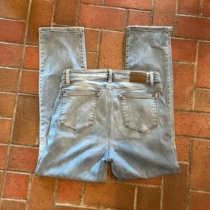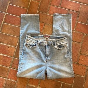 These Judy Blue jeans feature a timeless light-to-medium blue wash with distinctive golden-yellow contrast stitching. The denim is crafted for a casual, worn-in look, complete with double-stitched seams for durability. Ideal for everyday wear, these jeans offer both style and comfort.