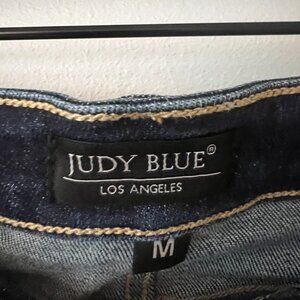 Judy Blue Dark Wash High Rise Distressed Jean Shorts- Women's Size Medium. Dark wash, holes/distressing, high rise, stretch denim. In good condition.