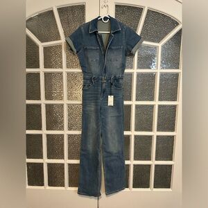 Stylish denim jumpsuit. Features short sleeves and front pockets. Perfect for casual wear.