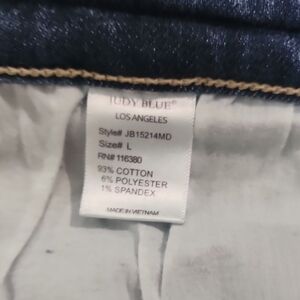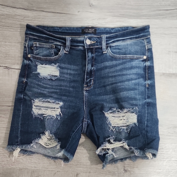 Trendy distressed jean shorts. Dark blue denim. Ideal for casual wear. size L