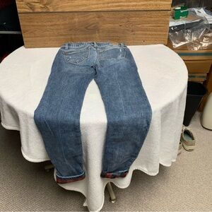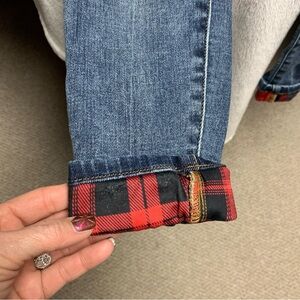 Stylish blue distressed jeans featuring unique plaid accents. No skin showing. Cuffs match the accents. Perfect for a trendy, casual look. (11)