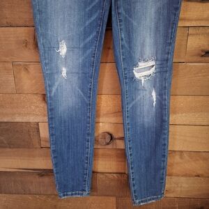 Keywords: Judy Blue skinny jeans, distressed jeans, stretch denim, casual ripped jeans, classic blue jeans, mid-rise skinny, comfy skinny jeans, everyday denim, women’s trendy jeans