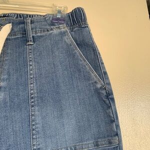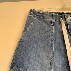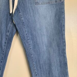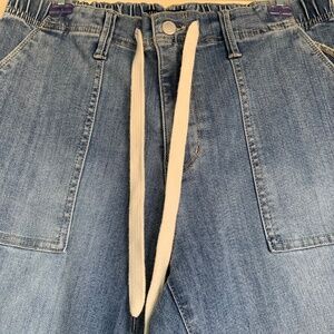 Pre- owned condition with general light wear. These have an elastic waistband with drawstring cord in front. Wider pockets in front and back, and a straight tapered leg. There is one mark in back of leg that is slightly darker, but honestly it looks like it came from manufacturing that way. Medium Light Wash Denim. Waist-32" before stretching, Rise-11.5", Inseam-30".