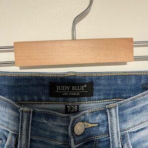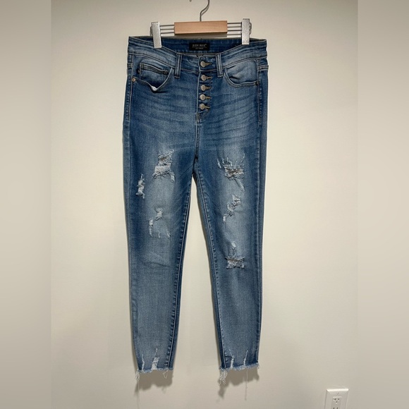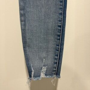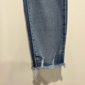 Trendy high rise jeans with distressed details. Perfect for casual outings.