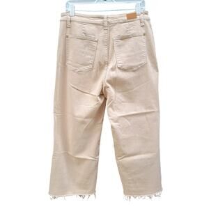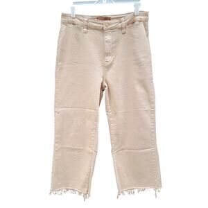 Khaki color high rise cropped wide leg stretchy jean. Has a raw frayed hem. Stretch for a perfect fit! Button zipper closure in front. True khaki tan color