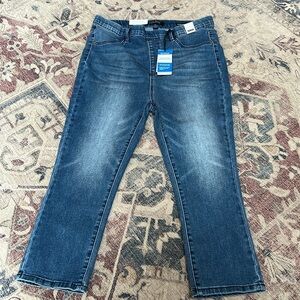 Faux front pockets, Functional back pockets, Medium Wash Non Distressed Pull On Capri