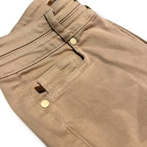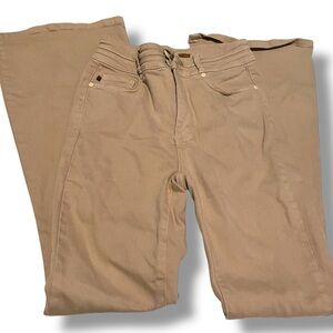 khaki jeans in size 5/27. These pants feature a flared leg style, zip and button closure, and are designed for women in a regular fit. The khaki color adds a versatile and stylish touch to the wardrobe, making them a fashionable choice for everyday wear. Perfect for pairing with different tops and shoes, these jeans are both trendy and comfortable for all-day wear.