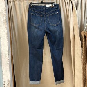 These jeans are super cute & comfortable, especially with the pull on waist. They are folded at the ankle but can be unrolled. The inseam with the pant leg unrolled is 32 inches.
