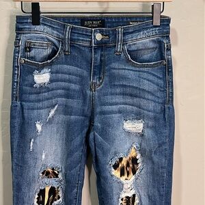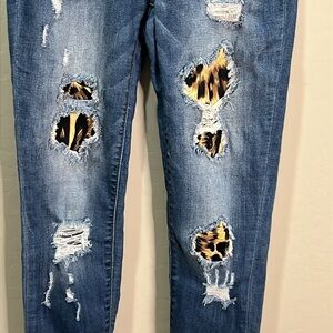 Judy Blue Jeans. Distressed with cheetah print fabric under holes. Soft and stretchy. Size 3/26. Skinny fit. See pics for measurements. Look to be great shape besides distressing.