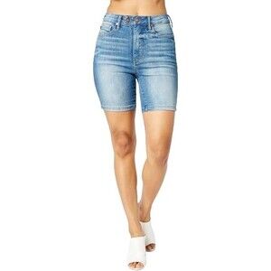 These Judy Blue XL Jean Shorts are a stylish Bermuda style with a double button for added detail. Made from denim with a comfortable stretch, they feature a high rise and a 7-inch inseam. Ideal for casual wear, travel, and activewear, these shorts are perfect for all seasons with a solid blue color and classic design. The 5-pocket design and waist size of 30 inches make them a versatile and trendy addition to your wardrobe.