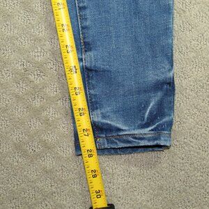 These Judy Blue skinny jeans are a size 27 with a high-rise waist and a 28-inch inseam. They feature a medium wash blue denim fabric with distressing, made of a blend of polyester, spandex, and cotton for stretch and comfort. The jeans have a zip closure, 5-pocket design, and button and zipper accents. They are machine washable and suitable for all seasons.