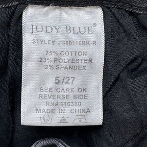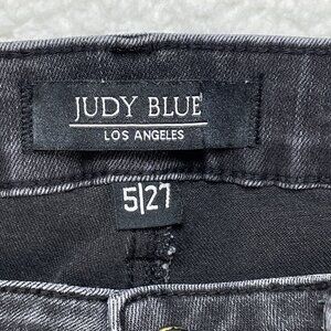These Judy Blue Jeans are a size 5 with a waist size of 27 inches. They are faded black with a raw frayed leg hem. These denim jeans feature a high rise waist and super flared leg. They are made from a stretchy cotton blend fabric amd and are machine washable. See the photos for details.