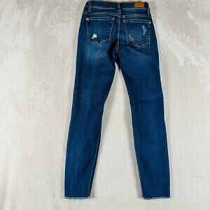 For sale is a: Judy Blue Jeans Womens 1/25 Medium Wash Blue Denim Destroyed Raw Slit Hem Skinny
