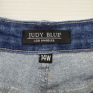 Judy Blue Women's jeans in size 14W with a straight fit and rainbow embroidered pocket. Made from a blend of polyester, spandex, and cotton denim.