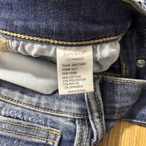 The product is a pair of Judy Blue jeans in women's size 5/27 with a relaxed fit, mid-rise design, and distressing. Made from a blend of polyester, spandex, and cotton denim in a solid blue color, these jeans feature a stretch fabric for added comfort and flexibility. With a straight leg style and 28-inch inseam, these mid-rise jeans are perfect for everyday wear and are designed to be both stylish and functional.