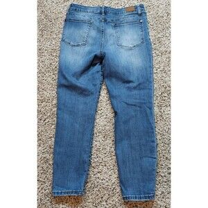 These Judy Blue Jeans in women's size 30 are a relaxed fit with a high rise and a tapered style, featuring a light wash denim fabric with a stretch for comfort. The jeans are distressed with a 5-pocket design and belt loops, making them perfect for all seasons. Made with a combination of polyester, spandex, rayon, and cotton, these jeans are machine washable for easy care. The solid blue color and zip closure give a stylish and trendy look, while the added accents like the zipper and logo detail add a touch of flair to the overall design.