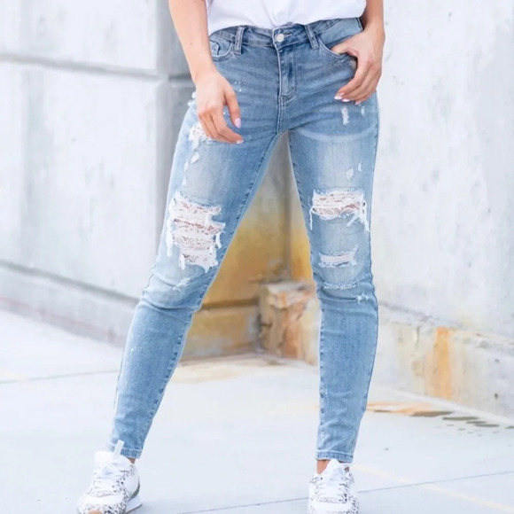 Judy Blue Lace Patch Distressed Light Wash Mid Rise Skinny Jeans