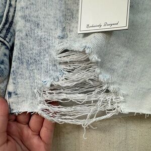 Trendy light wash jean shorts. Features distressed details and cute cherry embroidery. Perfect for casual outings.