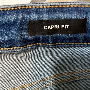 Stylish medium blue jeans with distressed accents. Rolled ankle design. Ideal for everyday wear.
