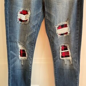 New with tags Judy Blue stretchy mid rise skinny jeans with a buffalo plaid patchwork pattern. The red plaid is perfect for the Christmas holiday!