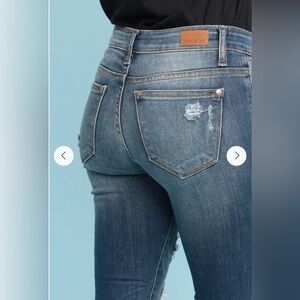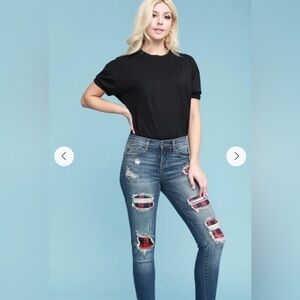 New with tags Judy Blue stretchy mid rise skinny jeans with a buffalo plaid patchwork pattern. The red plaid is perfect for the Christmas holiday!
