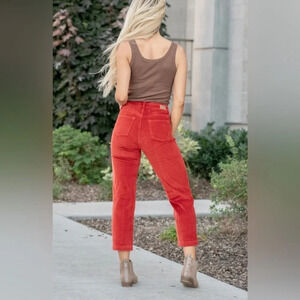 Above ankle, exposed button fly for a retro vibe. Like new condition.