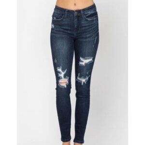 Judy Blue Skinny Fit Jeans Women's Destressed Dark Wash Stretch Tapered Leg.