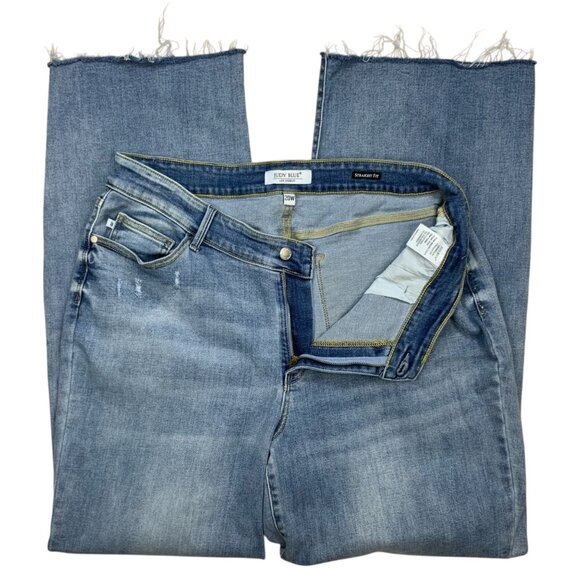 This Judy Blue women's Straight Fit Jean gives a distressed look to a classic style due to it's V-front waistband, high rise, zip fly, straight leg, pockets, belt loops, cutoff frayed raw cuffs, full length, plus size and light blue washed denim.