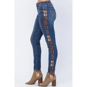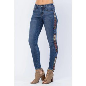 Description:The Judy Blue Jeans that everyone loves! Judy Blue does an amazing job at creating a unique blend of materials to bring you jeans that are the perfect stretch but remain a denim style! This style features a mid-rise in a dark blue 4-way stretch denim with a western motif fabric down the sides of the jeans.