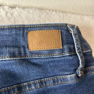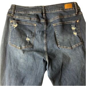 These are Judy Blue Women's size 18W skinny fit distressed jeans in a dark wash. The jeans feature a stretch fabric for added comfort. They have button and zipper accents, making them a casual yet stylish choice for everyday wear.