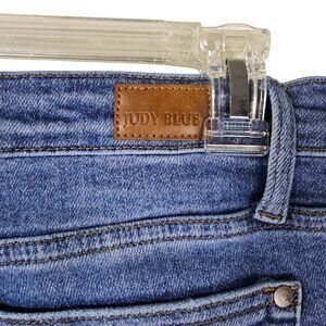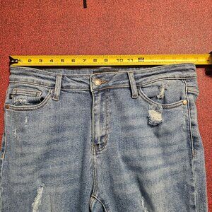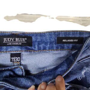 Judy Blue jeans, distressed denim, relaxed fit jeans, blue jeans women, stretchy denim pants, casual jeans, medium wash jeans, women's denim size 11, trendy jeans, ripped jeans women, comfortable jeans, Judy Blue relaxed fit, women's distressed jeans, stretch, tapered, casual, grunge, high rise
