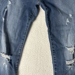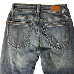 These Judy Blue Women's Jeans in size 26 feature a regular fit with a skinny style. The medium wash gives them a casual, norm core look. Made with stretch fabric, these distressed jeans also include button and zipper accents for added detail. Perfect for everyday wear, these jeans are a versatile and stylish addition to any wardrobe.